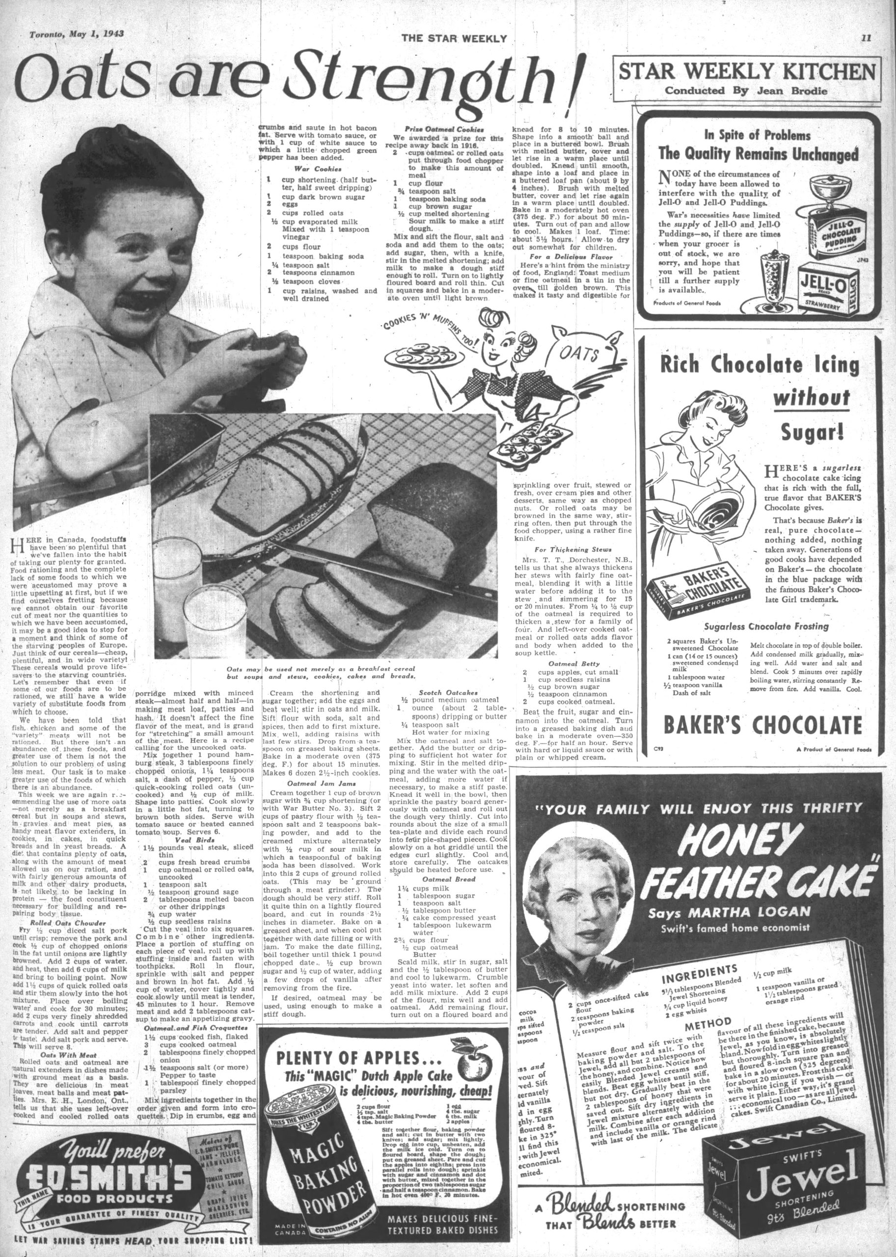 Looking into it, it is from the May 1, 1943 Star Weekly. The article is called “Oats are Strength!” from the Star Weekly Kitchen, and since this is war time, recipes during rationing are highlighted.