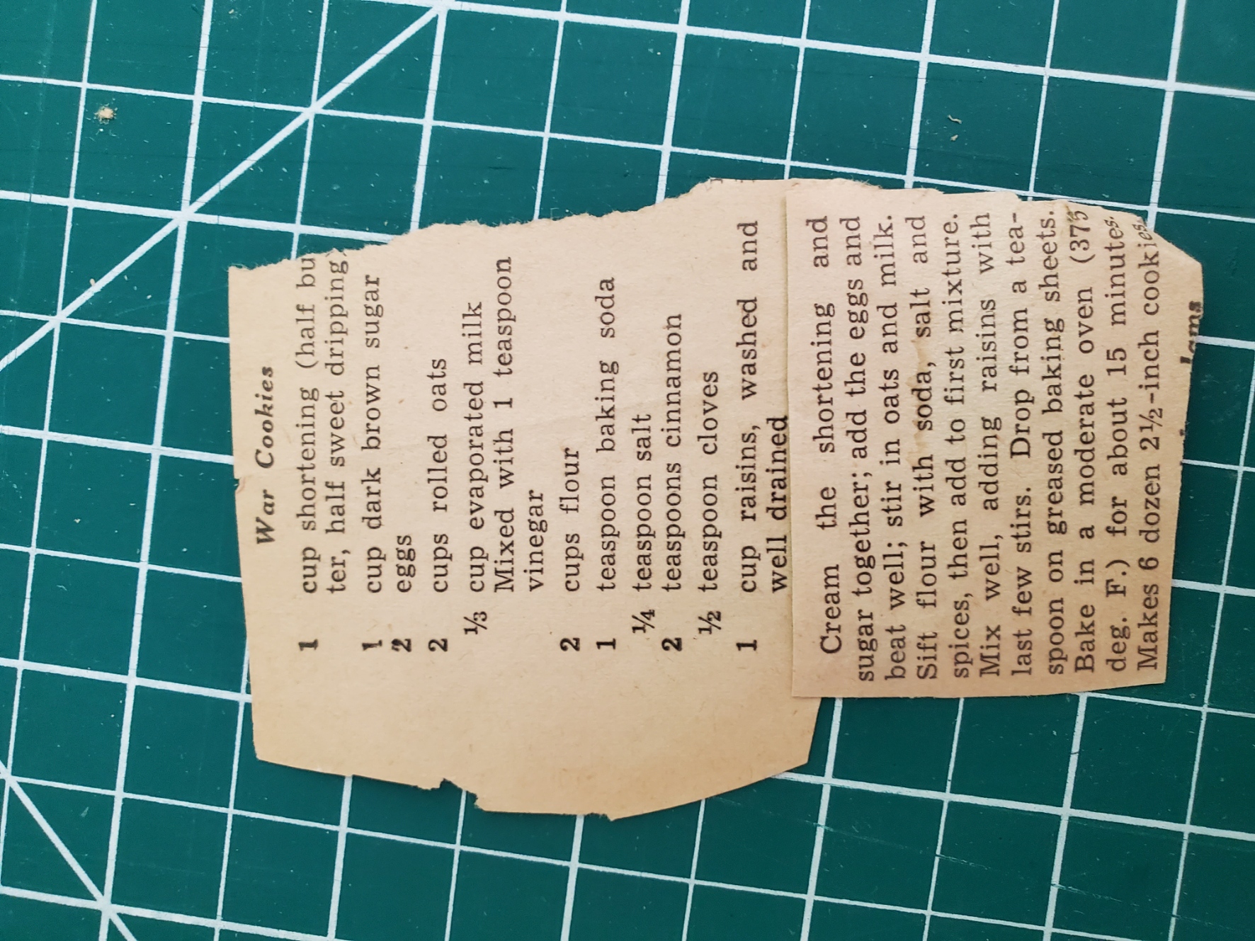 I will be taking a book repair course in a few weeks, and decided to take down a book from our collection to see what can be done with it. It is “The Art of Cooking and Serving” from 1930. It was given to my wife’s great-aunt for her wedding in 1931, and passed down to my wife in 1991. I had not given it much thought since then, but while looking through the book, there was a recipe for “war cookies” clipped and inserted.